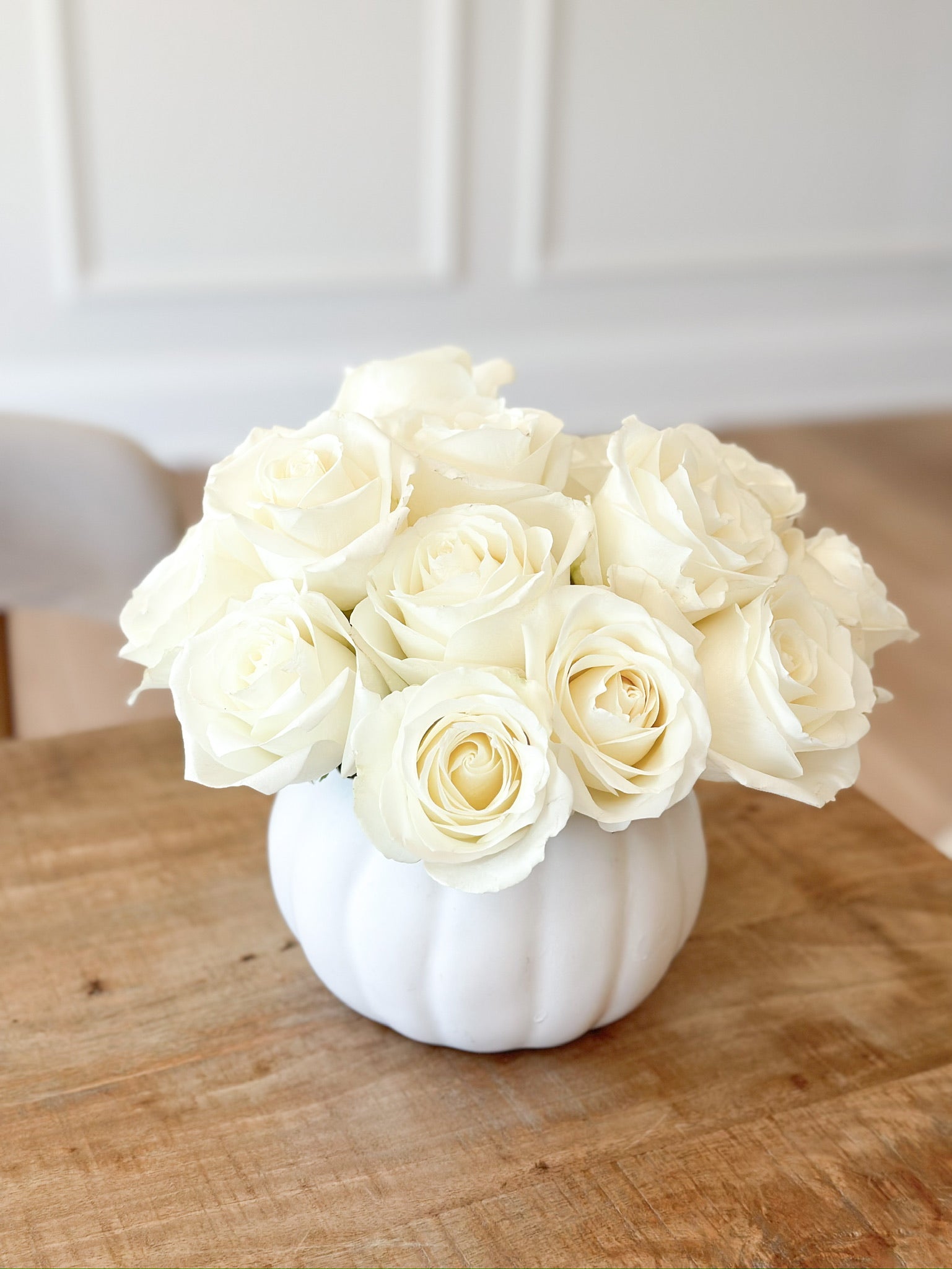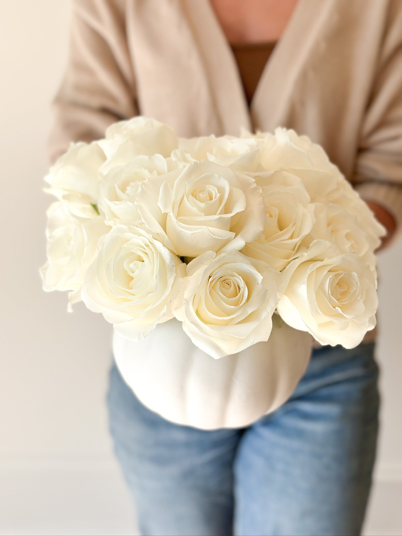 A modern take on autumn, this arrangement is the perfect gift to give to someone extra special. Premium white roses arranged in a white ceramic pumpkin.