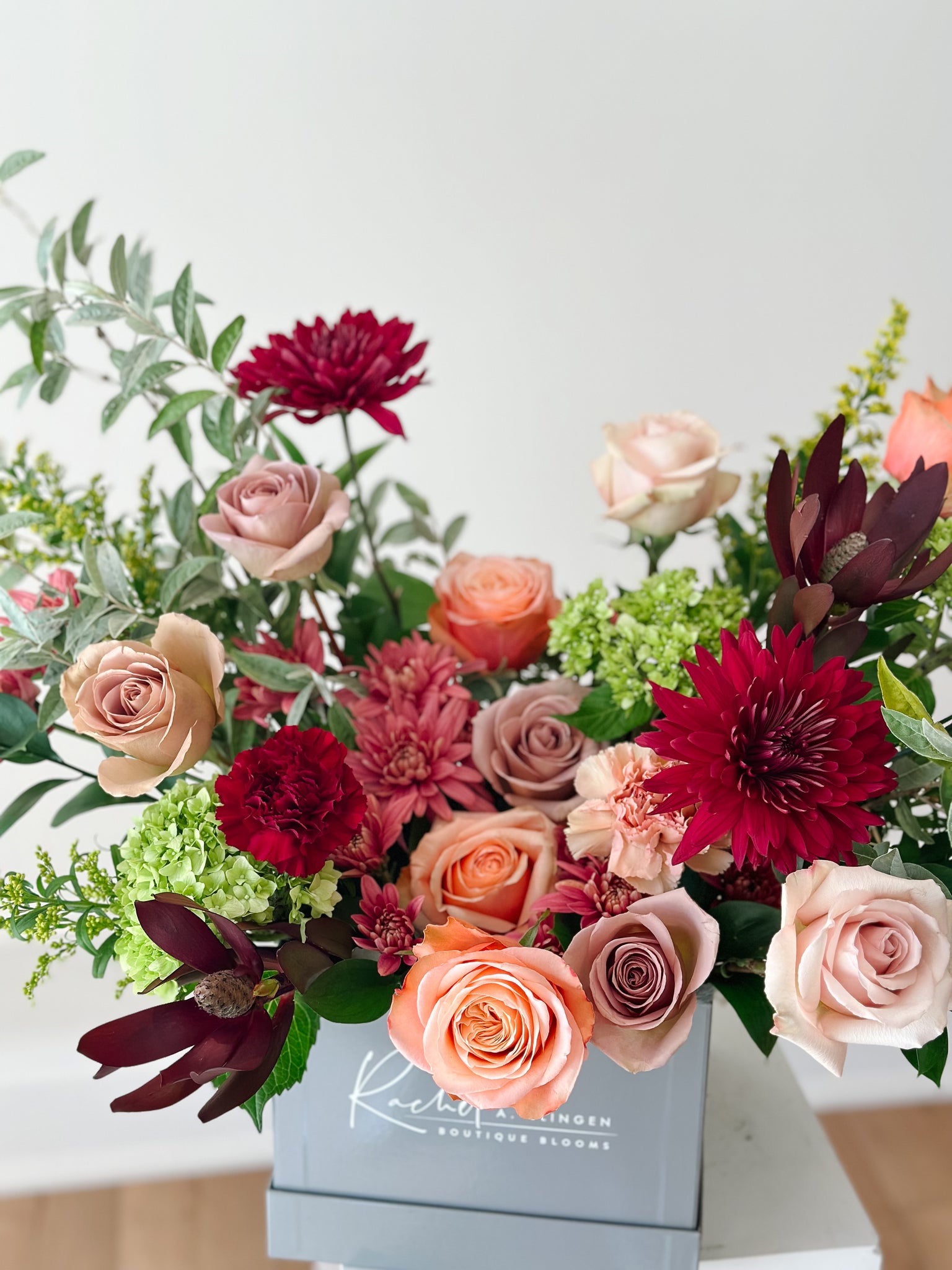 Bring the beauty of autumn indoors with Spiced Cider — a rich and textured arrangement inspired by the colors of the season. Deep burgundy blooms, vibrant orange florals, soft neutrals, and sculptural branches come together in a beautifully designed flower box. Warm, inviting, and full of natural charm, this piece adds the perfect seasonal touch to any space.