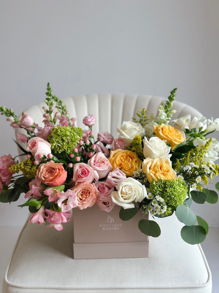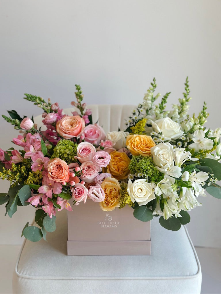 "Just So Pretty" features a stunning array of bright blooms, thoughtfully arranged in one of our signature bloom boxes. This mix of fresh flowers creates a beautiful textured and layered look that everyone loves. It’s the perfect way to send a thoughtful message, bringing warmth and beauty to anyone’s space.