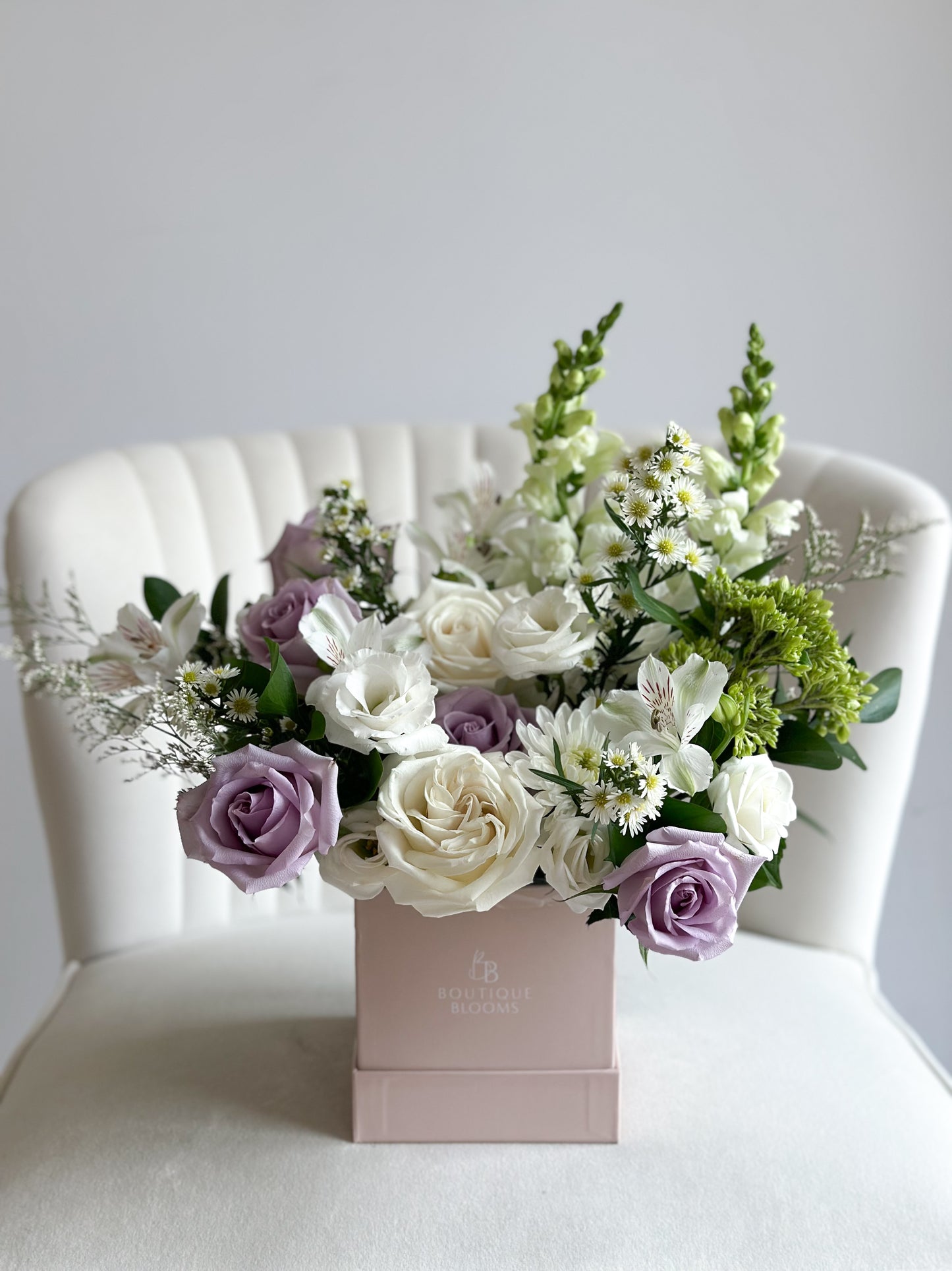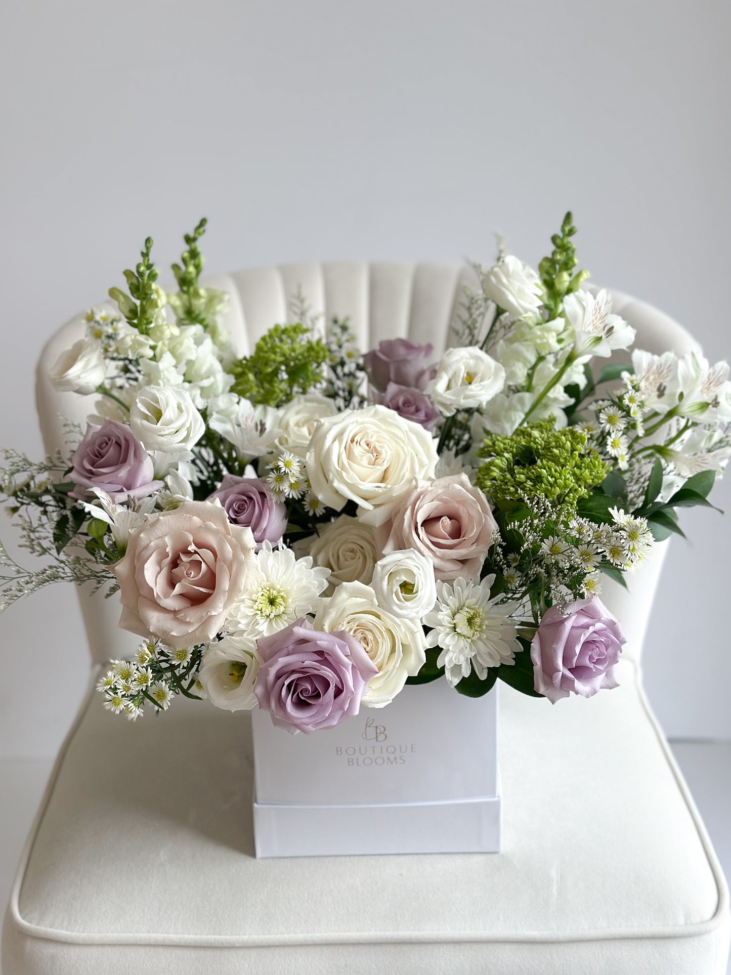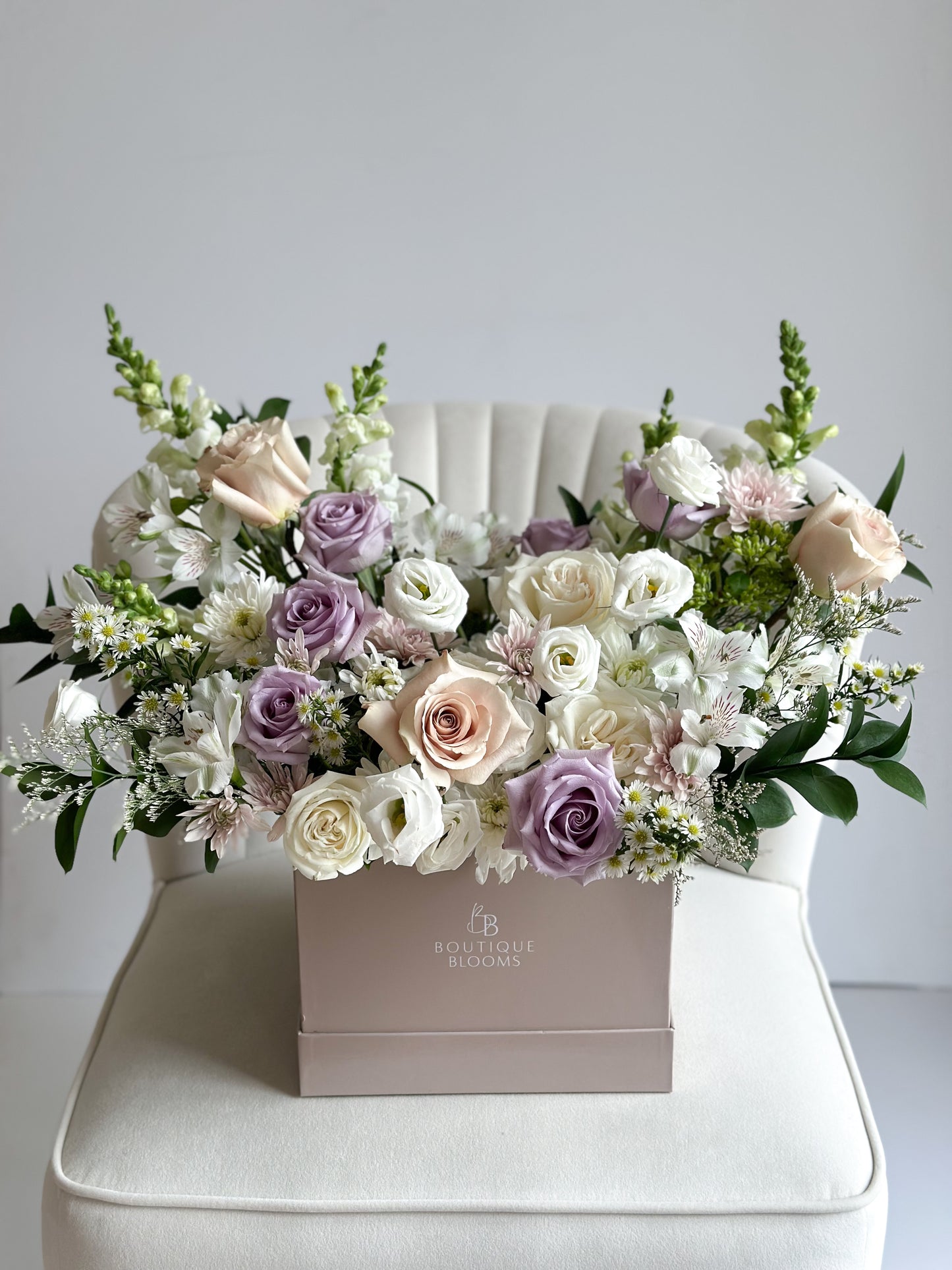 A stylish mixed floral arrangement designed to make a lasting impression. Overflowing with seasonal flowers in soft mauves and creams. This premium floral box makes the perfect birthday gift, anniversary arrangement, or sympathy piece.