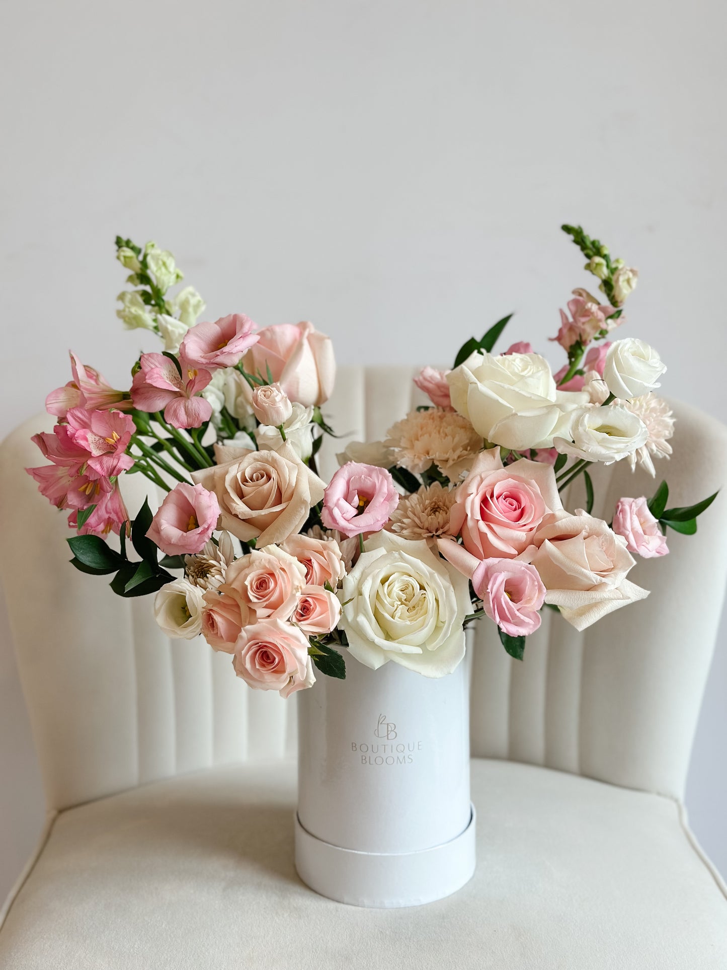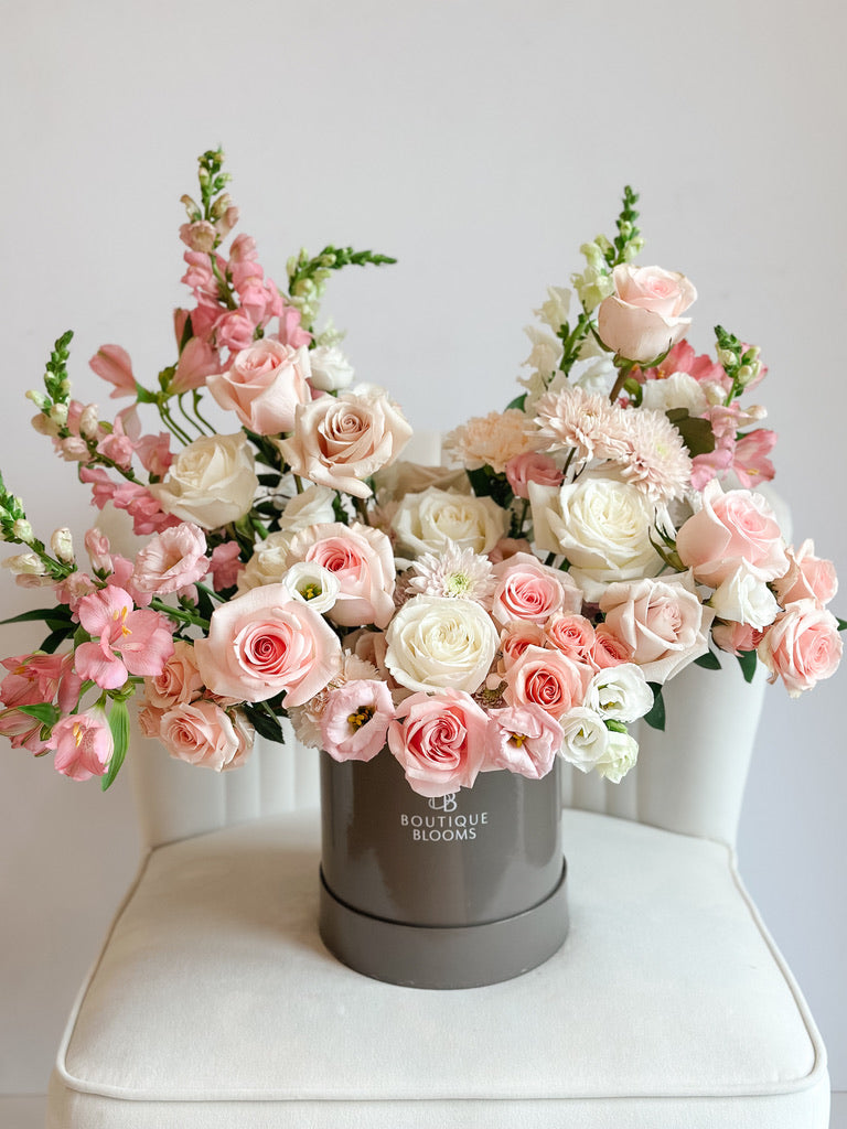 Sweetheart is a delicate and romantic arrangement that combines soft cream, pastel pink, and the light blush tones of Quicksand roses. The gentle colors create a soft, feminine palette making this arrangement perfect for any occasion that calls for love and elegance.