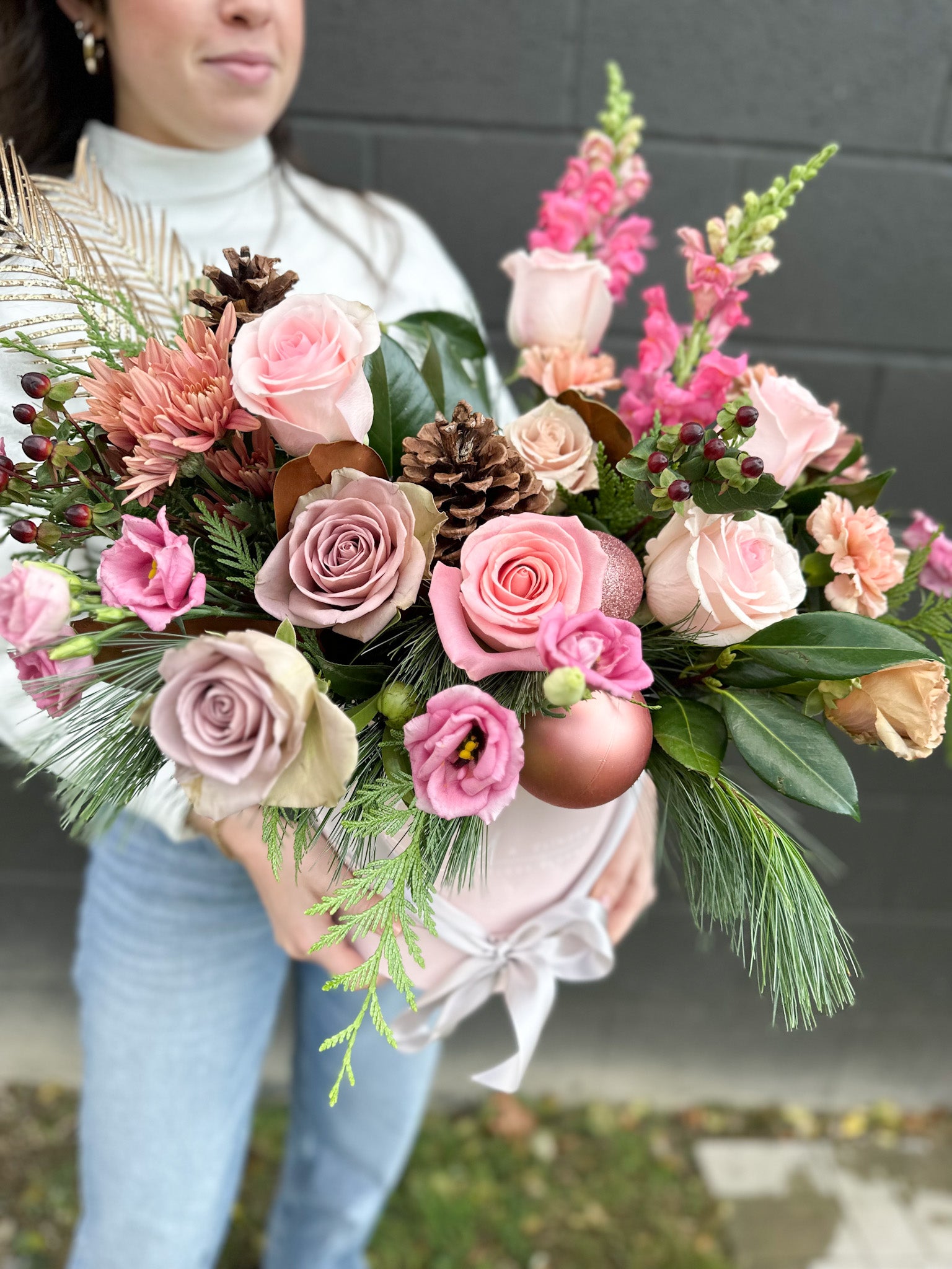 Featuring a palette of blush and soft pink blooms, this arrangement combines roses, lisianthus, and chrysanthemums with winter greenery, pinecones, and rose-gold ornaments for a touch of festive shimmer. The lush foliage and warm tones create a perfect balance of modern luxury and cozy seasonal charm.